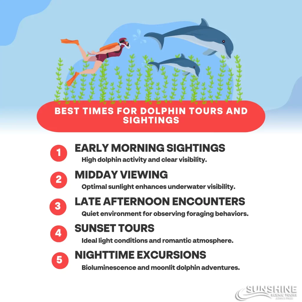 - Sunset and golden hours enhance dolphin visibility and provide a romantic atmosphere with increased dolphin activity.